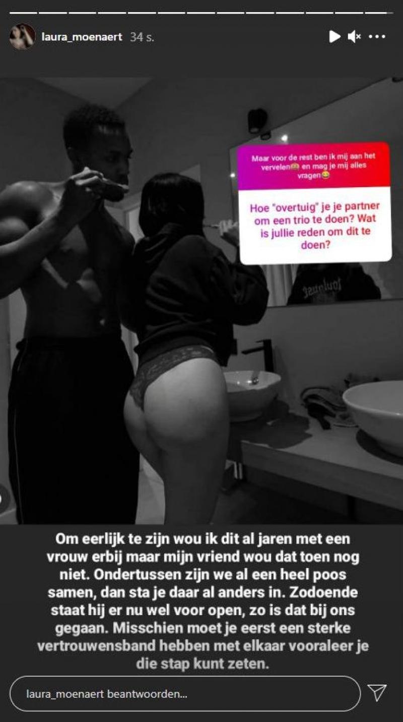 Vandaag kreeg Laura op Instagram de vraag waarom ze een trio willen en hoe je je partner overtuigt om mee te doen. Om eerlijk te zijn wou ik dit al jarenlang met een vrouw erbij, maar mijn vriend stond er toen nog niet voor open. Ondertussen zijn we al ruim 5 à 6 jaar samen, dan sta je daar al anders in. Nu staat hij er wel voor open. Ik denk dat je eerst een sterke klik/vertrouwensband moet hebben vooraleer je die stap zet, schrijft ze. Wat betreft de minimumleeftijd van de derde persoon is er voor hen veel mogelijk. Dat kan alle kanten uit. Natuurlijk zijn er grenzen, klinkt het.