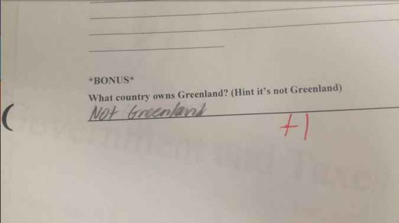 Op de sociale nieuwssite Reddit plaatste gebruiker Blahson een foto van de examenvraag met de woorden "een van hen heeft eindelijk de code gekraakt". Op de vraag "Welk land bezit Groenland? (Hint: het is niet Groenland)" antwoordde een leerling "Niet Groenland".