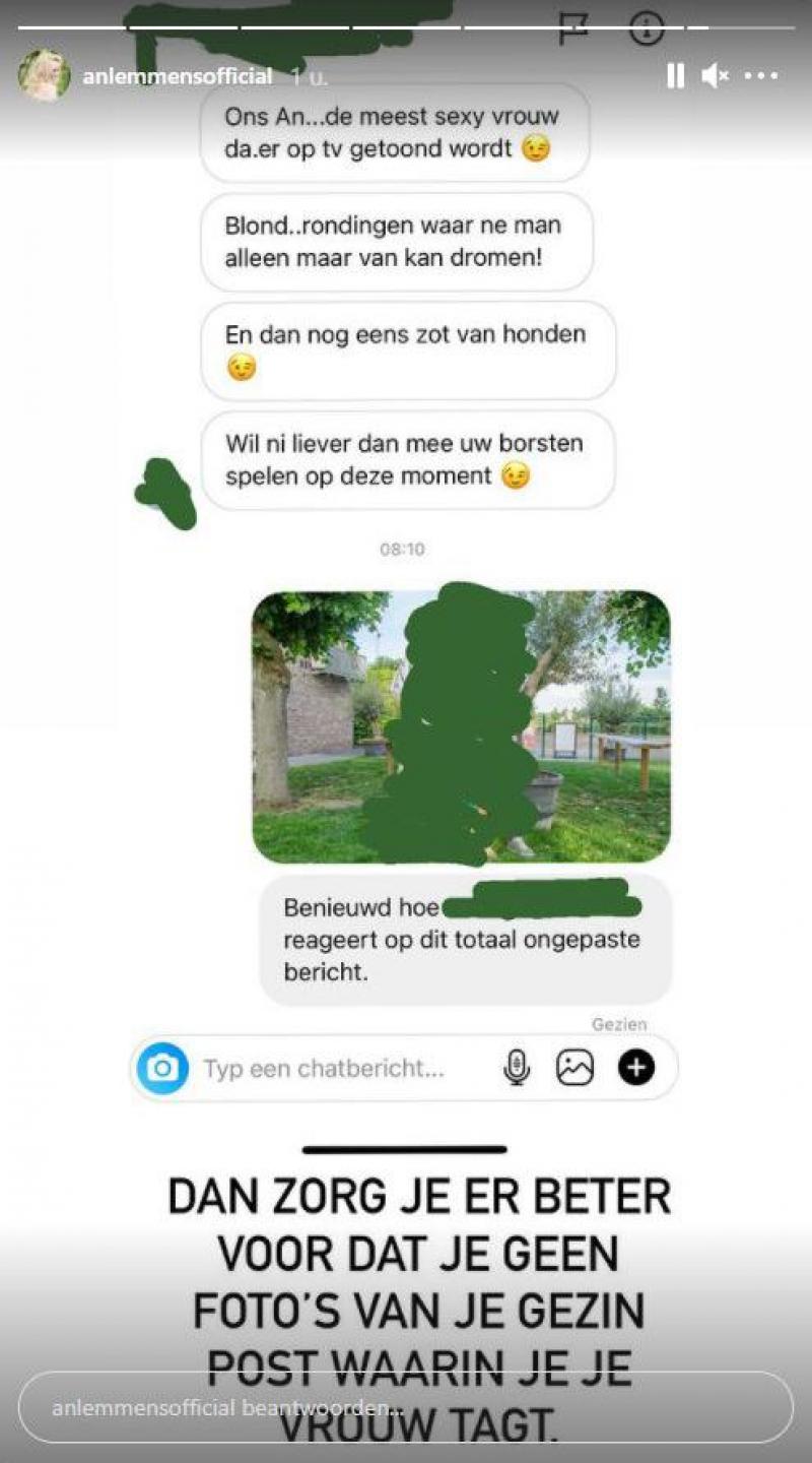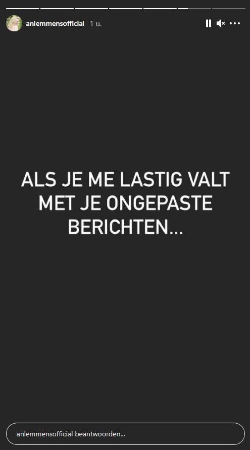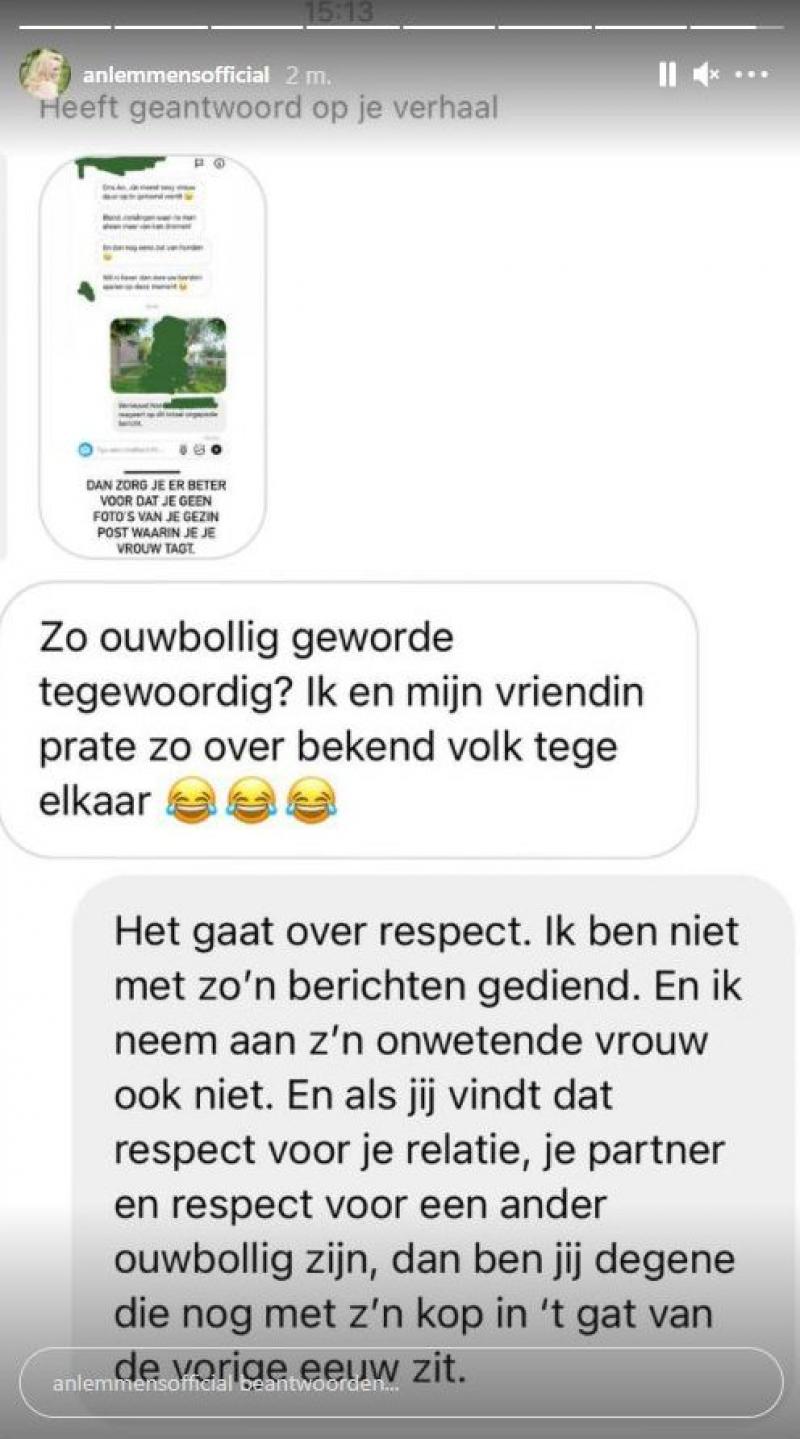Lemmens reageerde daarop met een foto van de bewuste man en zijn vrouw. "Ik ben niet met zo'n berichten gediend. En ik neem aan z'n onwetende vrouw ook niet. En als jij vindt dat respect voor je relatie, je partner en respect voor een ander oubollig zijn, dan ben jij degene die nog met z'n kop in 't gat van de vorige eeuw zit", klinkt het.