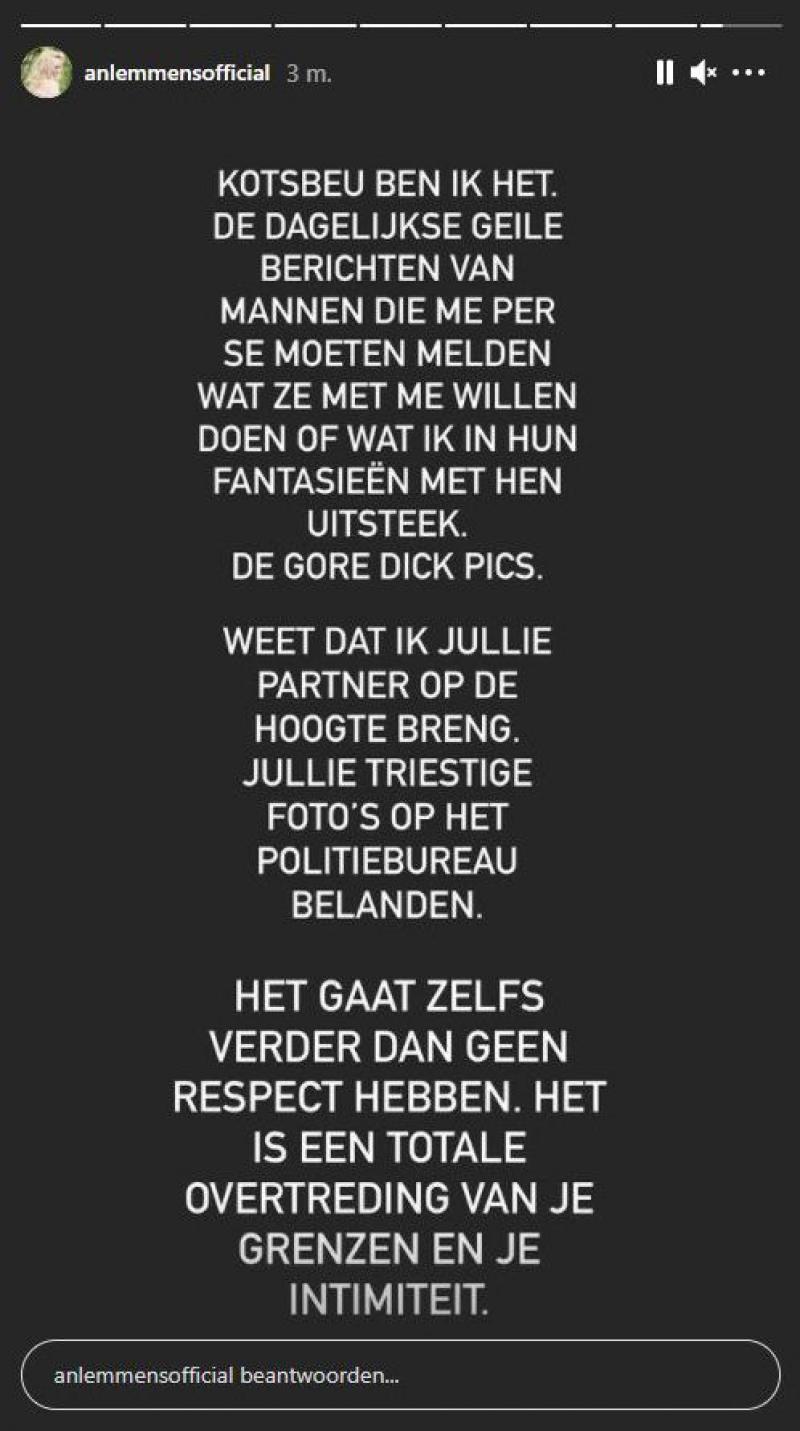 Vervolgens maakt ze duidelijk dat het gedaan moet zijn met dergelijke berichten. "Kotsbeu ben ik het, de dagdagelijkse geile berichten van mannen die me per se moeten melden wat ze met me willen doen of wat ik in hun fantasieën met hen uitsteek. De gore naaktfoto's. Weet dat ik jullie partner op de hoogte breng. Jullie triestige foto's op het politiebureau belanden. Het gaat zelfs verder dan geen respect hebben. Het is een totale overtreding van je grenzen en je intimiteit", besluit ze.