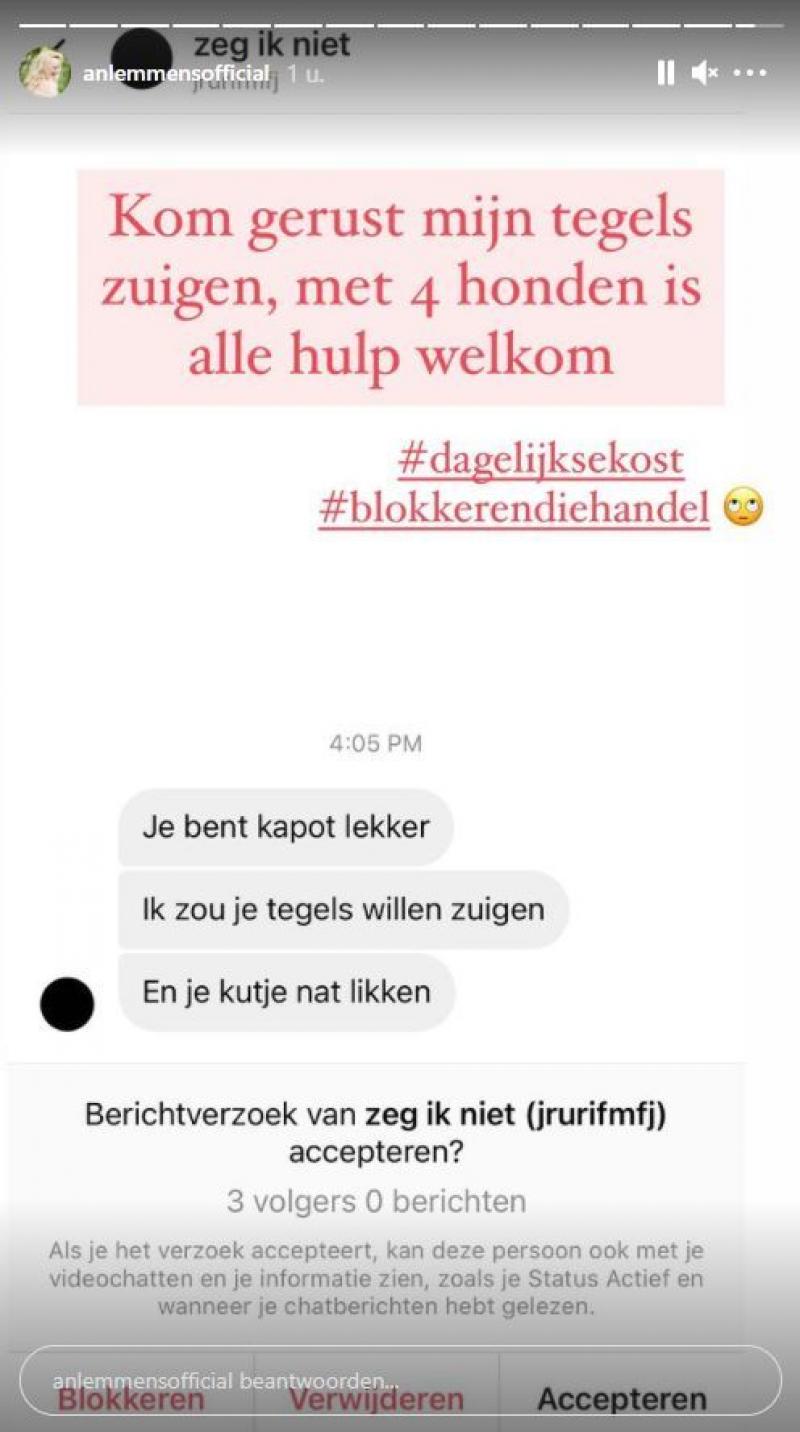 De 40-jarige Boer zkt Vrouw'-presentatrice kreeg een onbeschoft berichtverzoek van een anonieme man. Je bent kapot lekker. Ik zou je tegels willen zuigen, stuurde hij haar.