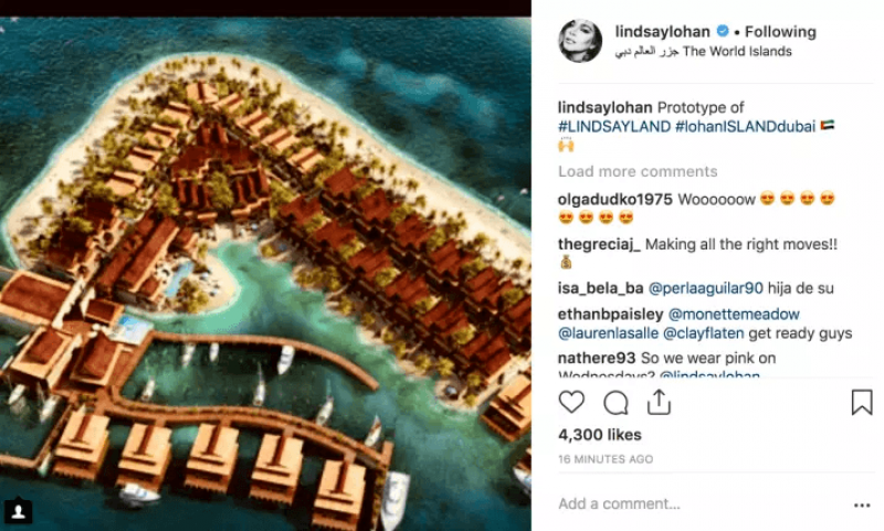Op vier kilometer van de kust van Dubai, waar de acrice momenteel woont, werd een groep eilanden aangelegd genaamd 'The World Islands'. De groep luxueuze eilanden vertegenwoordigt verschillende delen van de wereld. Het volledige project zal in 2020 afgerond zijn. Lohan kocht het eiland 'Thailand' en verbouwt het tot een toeristisch oord.
