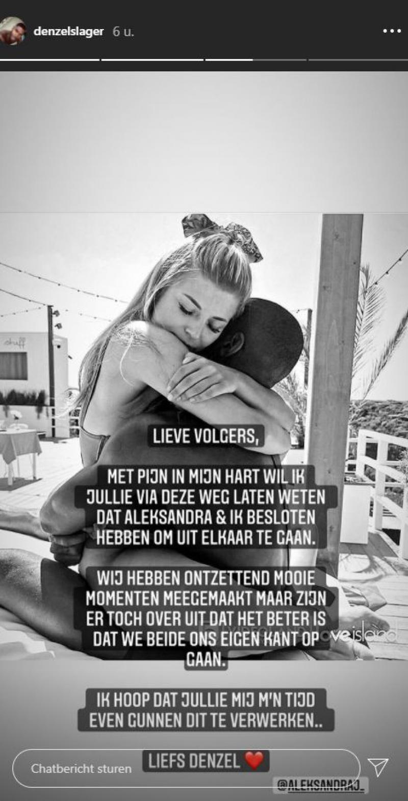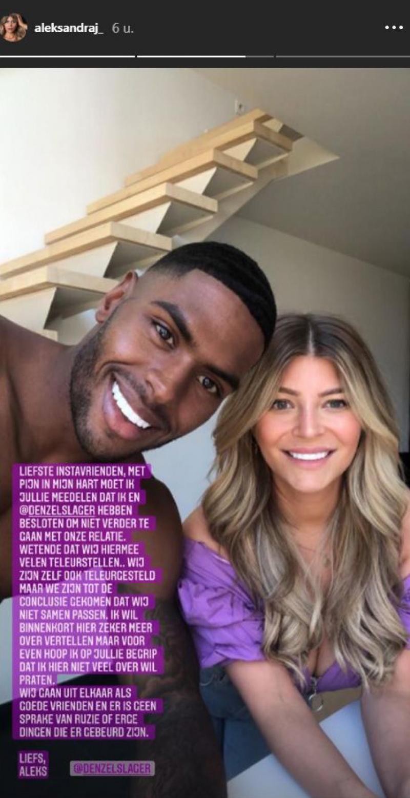 Aleksandra benadrukt op Instagram dat ze als vrienden uit elkaar gegaan zijn. Met pijn in het hart moet ik jullie meedelen dat ik en Denzel besloten hebben om niet verder te gaan met onze relatie. We weten dat we hiermee velen teleurstellen. We zijn zelf ook teleurgesteld, maar we zijn tot de conclusie gekomen dat we niet samen passen. Ik wil hier binnenkort zeker meer over vertellen, maar voor even hoop ik op jullie begrip dat ik hier niet veel over wil praten. Wij gaan uit elkaar als goede vrienden en er is geen sprake van ruzie of erge dingen die er gebeurd zijn, schrijft ze.
