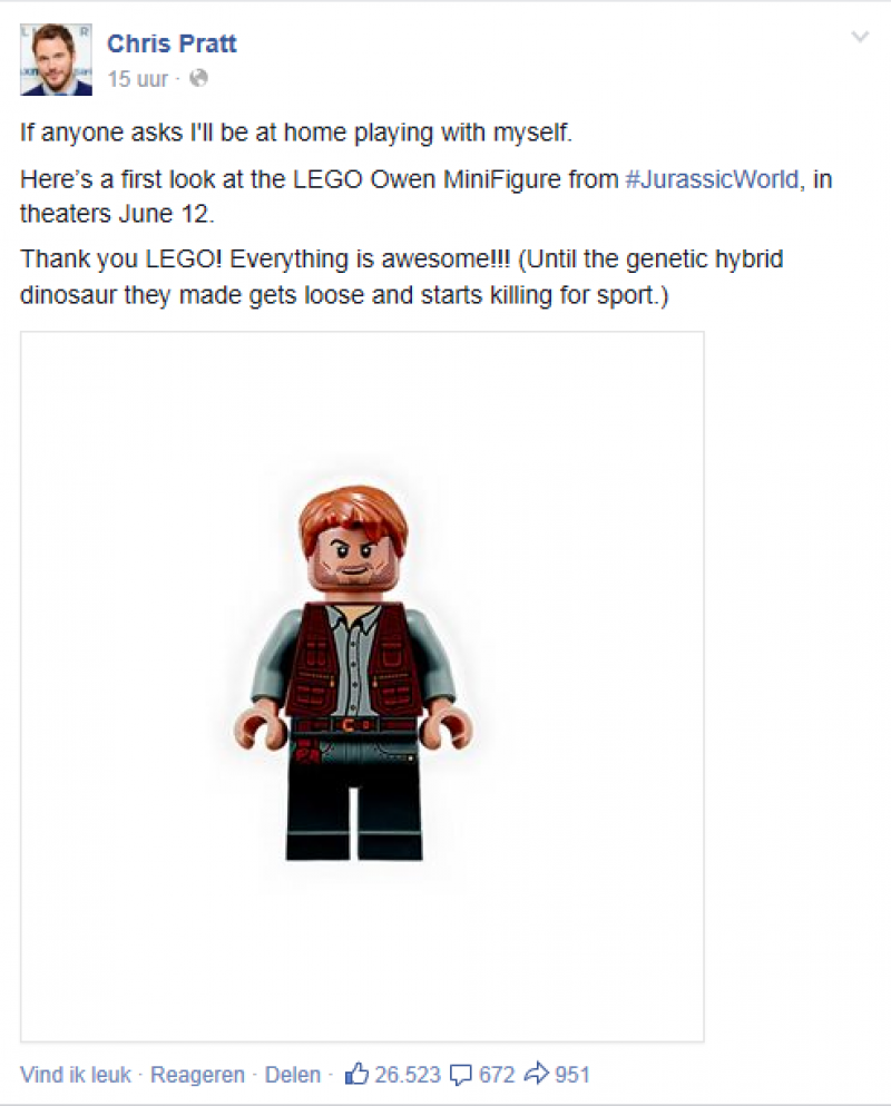 Hoewel de film pas op 12 juni in de bioscopen uitkomt, draait de marketingmachine voor Jurassic World al op volle toeren. Sneak peeks, trailers en previews van trailers hebben we al gehad en het publiek reageert in het algemeen enthousiast op de film. Reden genoeg voor LEGO om alvast een graantje mee te pikken van het naderende succes door een eigen minifigure van hoofdrolspeler Chris Pratt te maken. Ook de genetisch gemodificeerde dinosaurus die de antagonist in de film zal zijn, werd al omgezet naar LEGO.