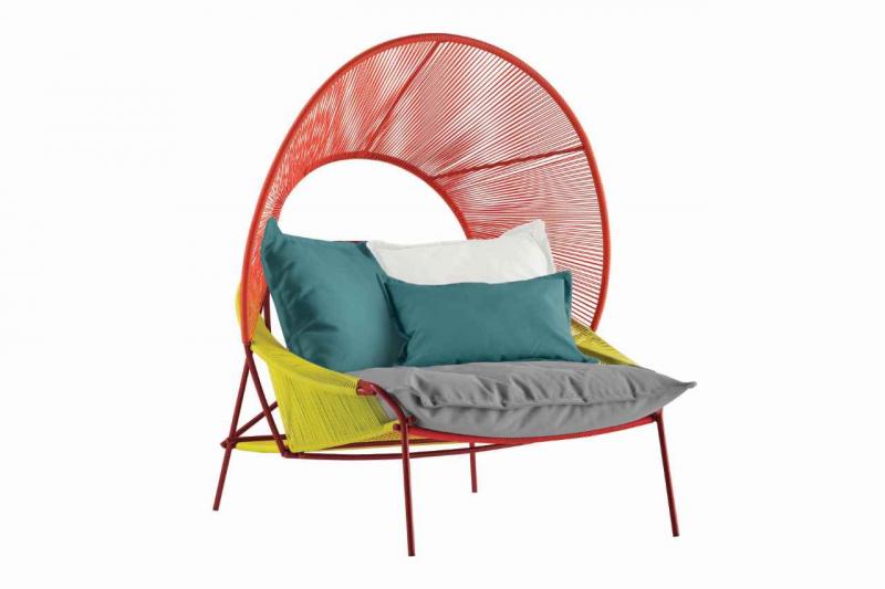 Designer Stephen Burks creëerde voor Roche Bobois de Traveler' kapstoel. Zijn gelakte aluminium structuur en polyethyleen draden ondersteunen een groot zitkussen, twee kussen voor de rug en een voor de onderrug.