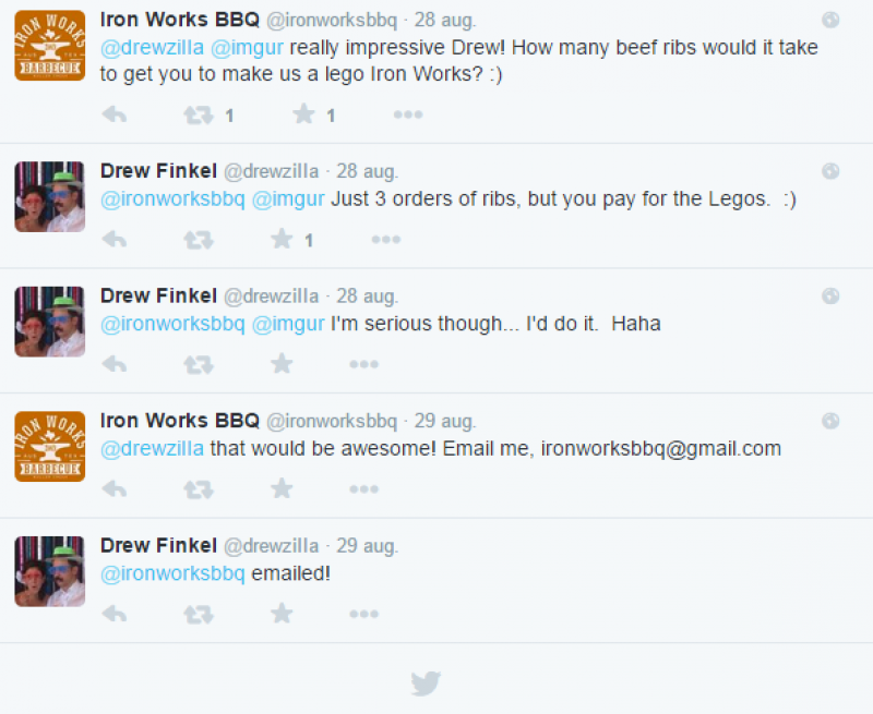 Een Amerikaanse man ging een uitdaging aan met een barbecue restaurant. Drew Finkel zou hun restaurant, Iron Works BBQ, maken in Lego en hij zou worden betaald in ribbetjes.