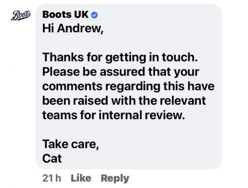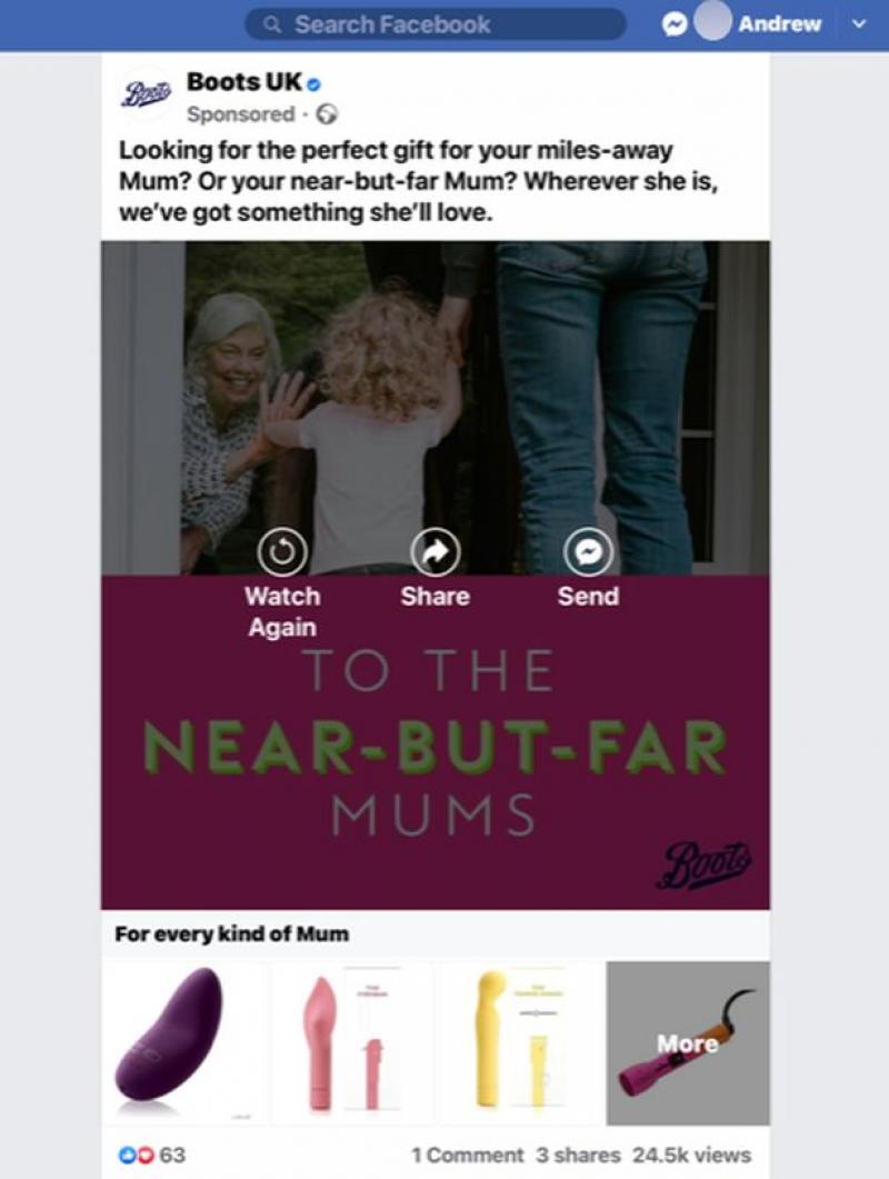 Boots verontschuldigde zich voor de vergissing en legde uit uit dat door een 'technische fout' twee afzonderlijke advertenties tot één werden gecombineerd, terwijl Facebook toegaf dat ze een 'fout' hadden gemaakt door de advertentie niet te vlaggen.