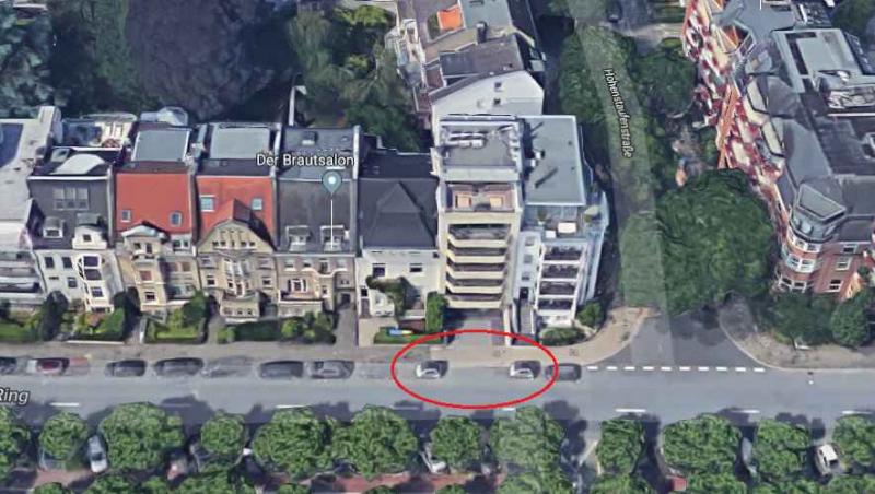 De man uit Düsseldorf heeft twee Smarts gekocht die aan weerszijden van de oprit staan te blinken. De twee vierwielers staan op zes meter afstand van elkaar. Genoeg plaats dus voor de rijke chauffeur om zijn SUV te parkeren in de garage.
