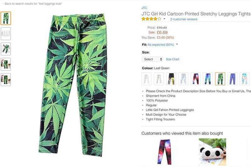 De gebladerde leggings worden verkocht door AOSHILONG-Baby. Deze partij ontkent dat het om marihuana gaat en zegt dat het gewoon een gebladerd printje is.