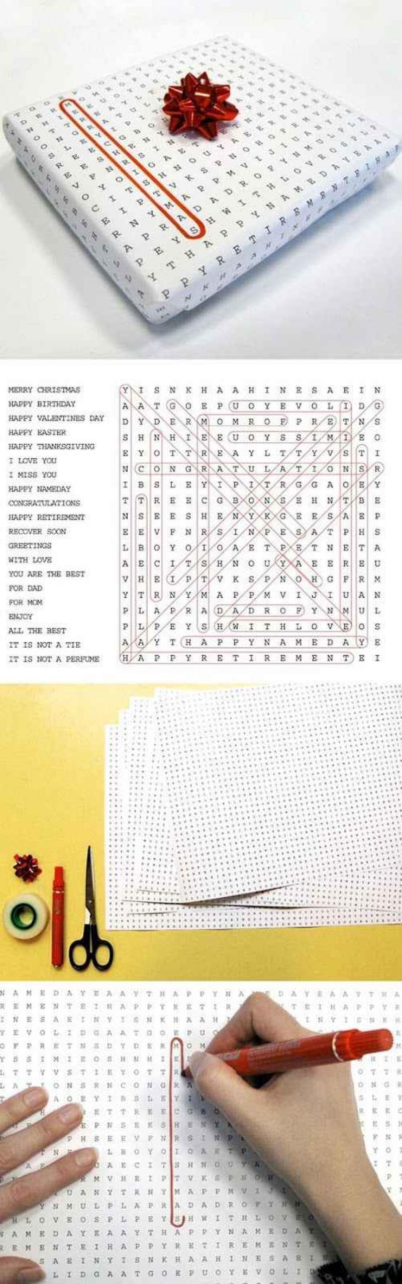 Maak het openen van je cadeau een uitdaging en pak het in met een woordzoeker, rebus of kruiswoordraadsel. Ontwikkel het spel zelf, dan kan je er een leuke kersteditie van maken en een persoonlijk boodschap in verwerken. Vorm met de overgebleven letters een zin of zeg iets in het antwoord van de rebus. Het cadeau mag pas open wanneer de oplossing is gevonden.