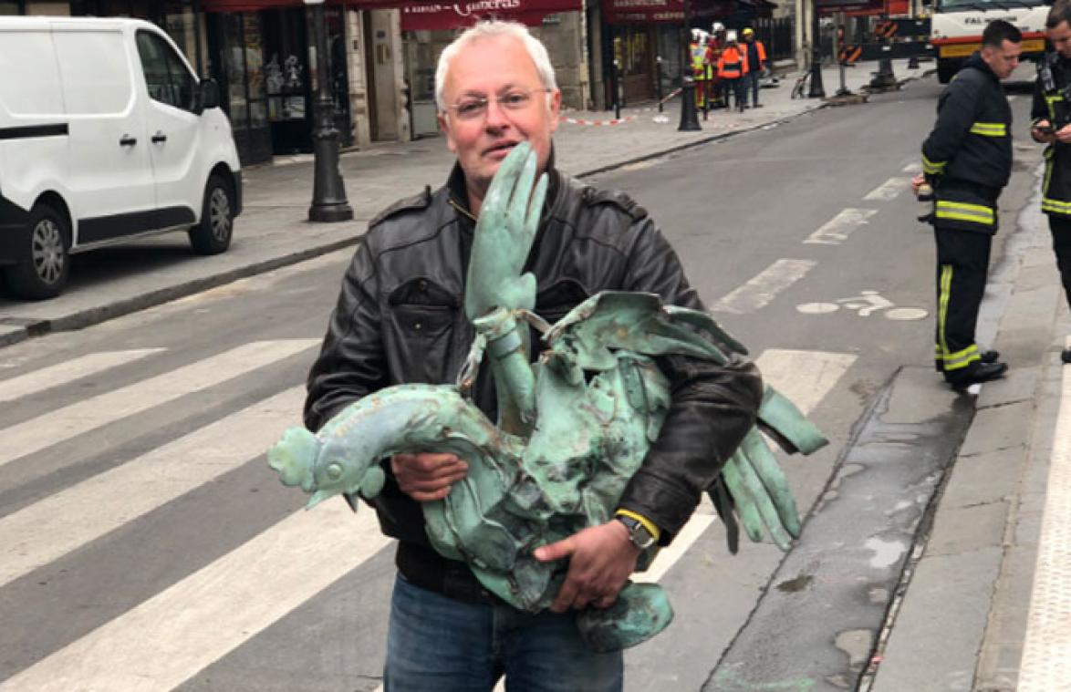Incroyable! Un de nos adhérents du @GMHistoriques a retrouvé dans les décombres le coq du haut de la flèche de #NotreDame Son intuition était la bonne! Merci à nos bâtisseurs passionnés du patrimoine pour leur engagement: Le savoir-faire français est là. #ReconstruireNotreDame pic.twitter.com/EG2yyj28Bm