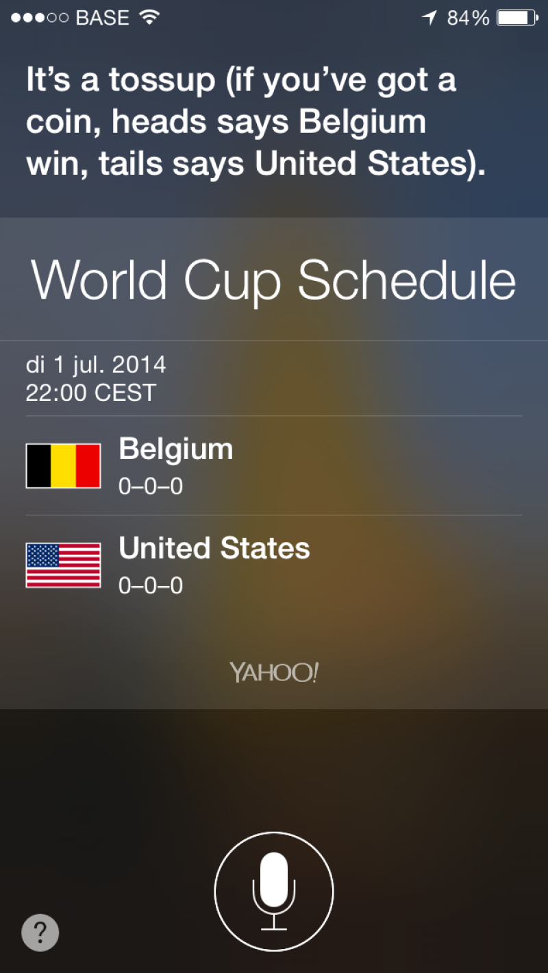 Cortana denkt dus dat de Belgen het morgenavond zullen halen. Voor de wedstrijden van vanavond krijgen Frankrijk en Duitsland de voorkeur. Aangezien Cortana voorlopig nog niet beschikbaar is in België, vroegen we aan haar tegenhanger bij Apple, Siri, wat zij van de wedstrijd denkt.