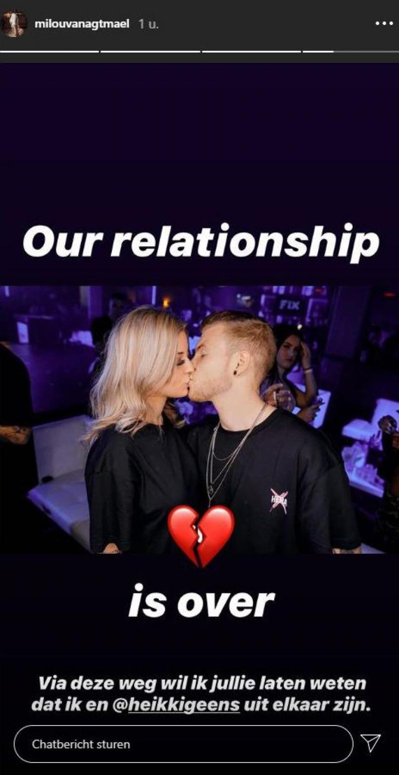 Via deze weg wil ik laten weten dat ik en Heikki Geens uit elkaar zijn, schrijft Milou van Agtmael vrijdagnamiddag op Instagram Stories. Daarmee lijkt nu definitief een einde te komen aan hun romance die eerder al eens afgebroken en opnieuw aangevat werd.