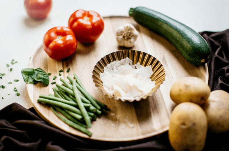 - Snij de courgette, de boontjes en de geschilde aardappel in kleine stukjes. Breng 1,5 liter gezouten water aan de kook. Doe de groenten in het water en laat ze een twintigtal minuten garen op een zacht vuur.