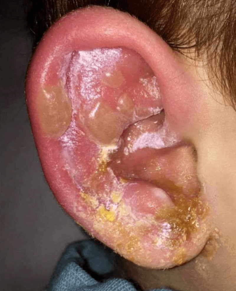 De Britse Laura Redfern deelde op Facebook een foto van het oor van haar vierjarig zoontje, die het herpes simplex virus (HSV) opliep toen iemand met een koortslip hem als pasgeboren baby kuste. Het herpesvirus blijft levenslang in het lichaam en kan altijd uitbreken. Een uitbraak vindt meestal plaats rond de mond in de vorm van koortsblaasjes, maar kan ook op andere verscheidene andere lichaamsdelen verschijnen.