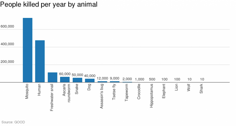 Killer op kop is de mug. Met zo'n 725.000 sterfgevallen per jaar is het irritante insect het gevaarlijkste dier ter wereld. Wij zelf, de mensen, staan dan weer in voor zo'n 475.000 dodelijke slachtoffers per jaar. De zoetwaterslak staat verrassend genoeg op de derde plaats, met zo'n 110.000 slachtoffers per jaar.