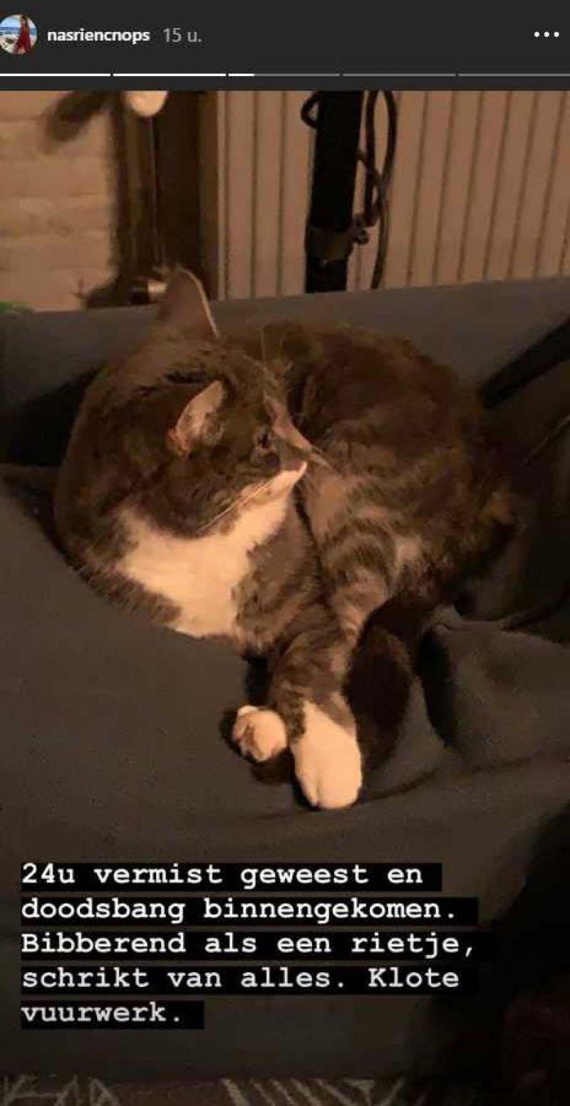 Haar kat schrok zich te pletter, was een tijdje vermist en kwam uiteindelijk bevend van de schrik terug boven water. 24 uur vermist geweest en doodsbang binnengekomen. Bibberend als een rietje, schrikt van alles. Klotevuurwerk, schrijft Nasrien op Instagram.