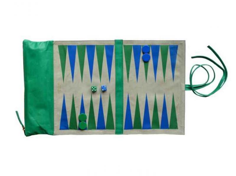Claire Vivier staat bekend om haar beruchte handtassen in alle formaten. Speciaal voor reizigers ontwierp ze deze toilettas die ook kan dienen als spelbord voor een potje backgammon. Voor het geval je je moest vervelen onderweg.