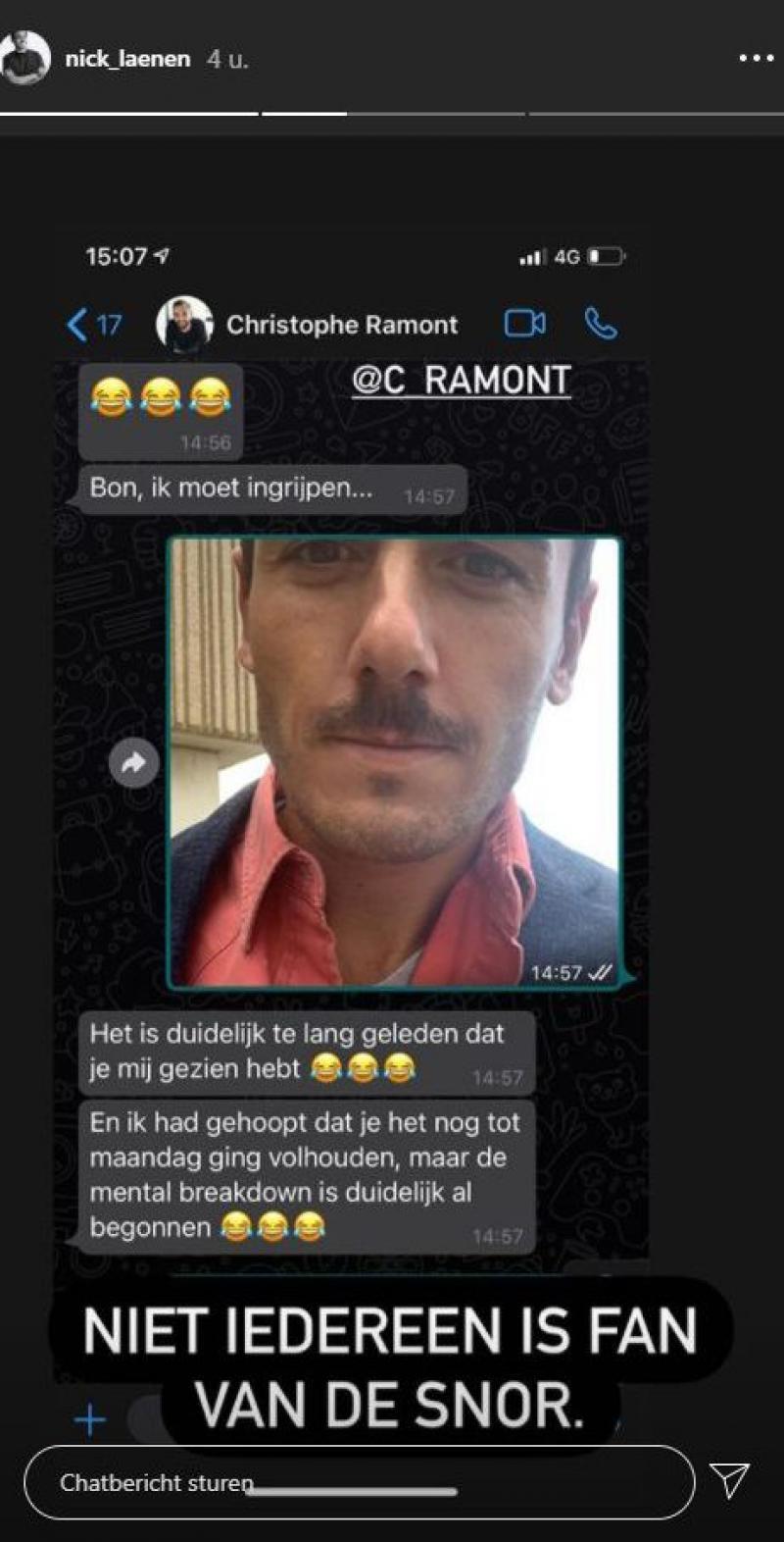 Onlangs besloot Nick om zijn stoppelbaardje in te ruilen voor een snor. Hij polste naar de mening van Christophe over zijn nieuwe look, maar die is kennelijk geen fan. Het is duidelijk te lang geleden dat je mij gezien hebt. En ik had gehoopt dat je het nog tot maandag ging volhouden, maar de mental breakdown is duidelijk al begonnen, reageerde Christophe.
