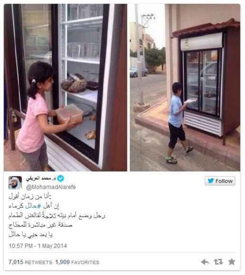 Een man uit het Saoudie-Arabische stadje Hail bracht een heel simpel idee in uitvoering. Hij zette een koelkast voor zijn huis en nodigde zijn buren uit om er eten in te doneren voor de minderbedeelden. Zo kunnen de mensen die geen geld hebben om eten te kopen toch eten. De anonieme weldoener wil vooral dat de schaamte die gepaard gaat met armoede geen drempel is om aan eten te komen.