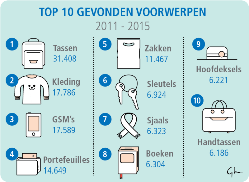 Elk jaar worden ruim 30.000 verloren voorwerpen teruggevonden in de trein of het station. Sinds 2011 waren dat er in totaal 181.538. Bepaalde categorieën springen er echt uit. Voor gsm's