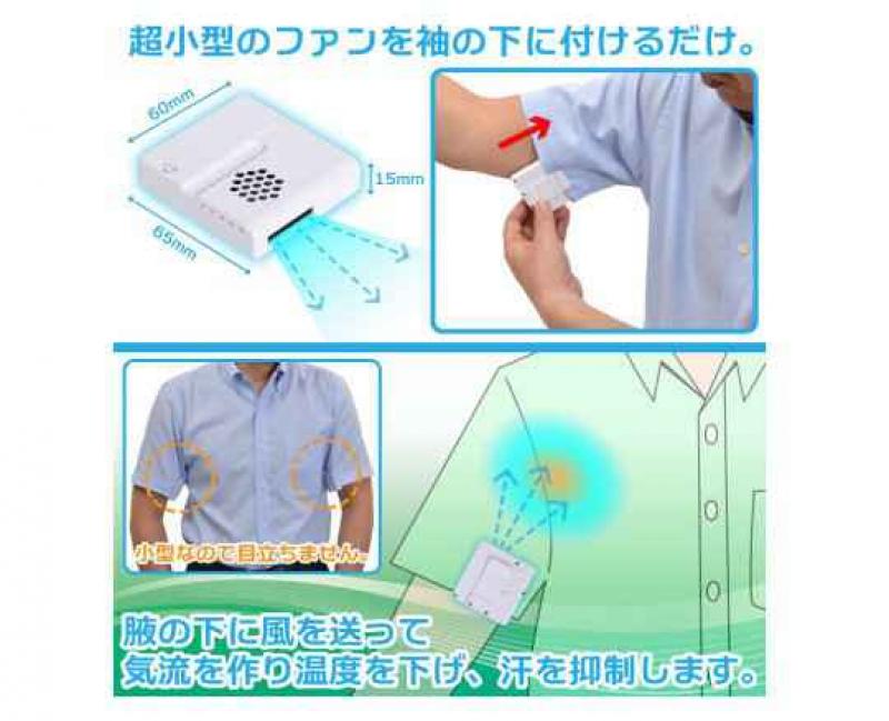 Het Japanse bedrijf Thanko heeft een oplossing gevonden voor die ongewenste watervorming. Hun nieuwste gadget is een ventilator die je aan een mouw vastspeldt en waarvan je de rotor op je oksel kan richten. Als je geen al te wilde bewegingen met je arm maakt, zal niemand doorhebben dat je een eigen windturbine in je oksel hebt steken.
