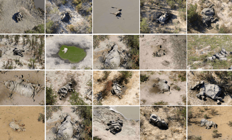 Begin mei werd al berichtgegeven van een eerste cluster van dode olifanten in de Okavango Delta in Botswana, waar in totaal ongeveer 15.000 olifanten leven. De dodentol liep eind die maand al op tot 169, en tegen midden juni was dat cijfer nog eens meer dan verdubbeld. Het werkelijke aantal zal echter nog hoger liggen, want olifantenkarkassen zijn vaak moeilijk te spotten.