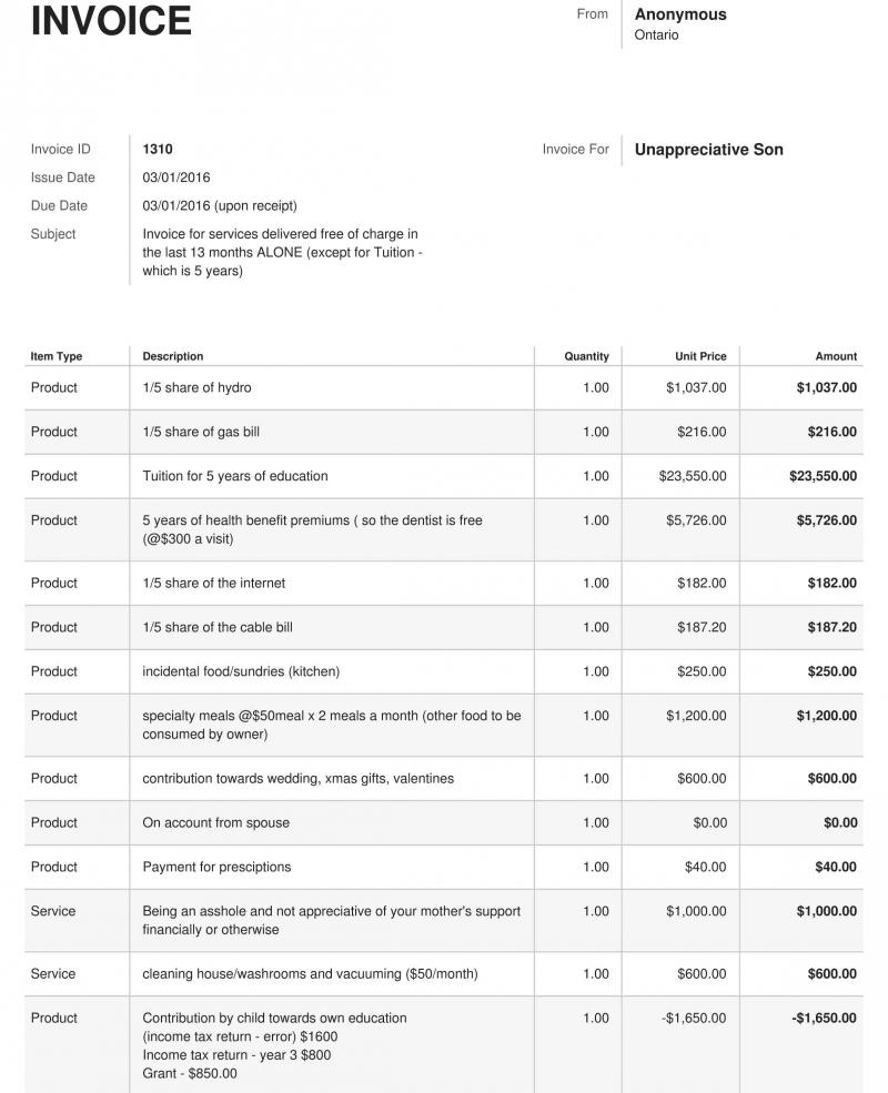 Ze rekende hem niet alleen kosten aan voor het gebruik van water, elektriciteit, internet en televisie, maar ook de ziekteverzekering en schoonmaakkosten moest hij betalen. Daarnaast moest Kevin ook 1.000 dollar neertellen omdat hij zich als een "klootzak gedroeg die de steun van zijn moeder niet apprecieerde". In totaal werd de zoon een bedrag gepresenteerd van 39.254,17 Canadese dollar, oftewel 26.711,52 euro.