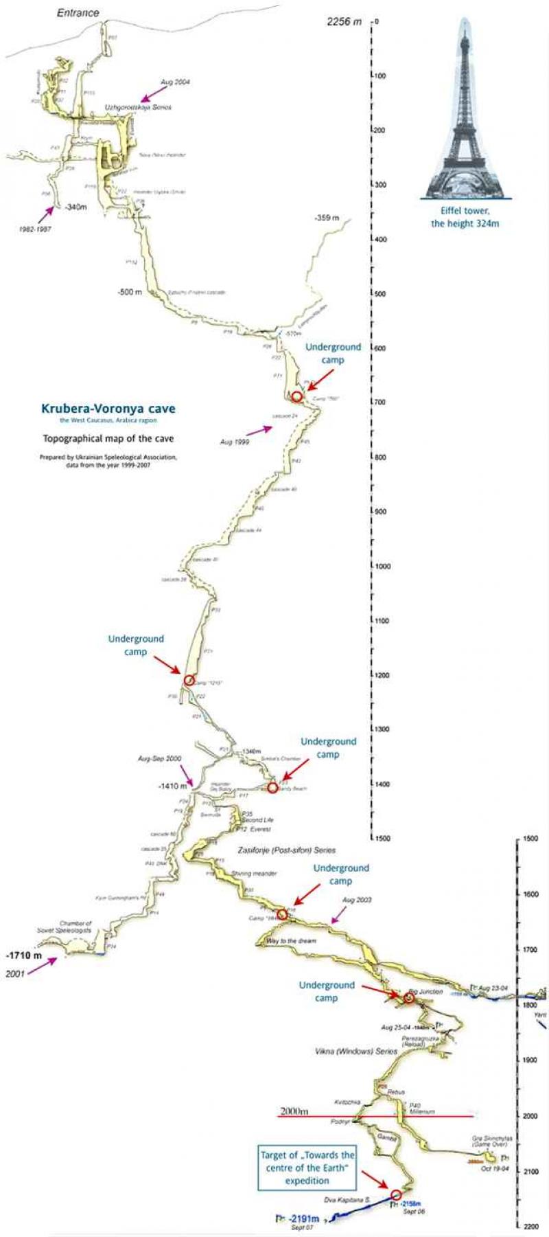 De kaart hieronder geeft een, voorlopig, volledig beeld van de grot van Kroeber. Let vooral op de plaatsen op 1.200, 1.400, 1.650 en 1.800 meter diepte. Op die dieptes hebben ze ondergrondse kampen gemaakt waar speleologen kunnen rusten tijdens hun expeditie. Sommige expedities duren langer dan drie weken, dus zo'n kampen zijn broodnodig. Speleologen vergelijken afdalen in de grot van Kroeber wel eens met een omgekeerde beklimming van de Mount Everest.