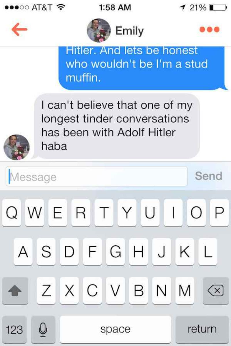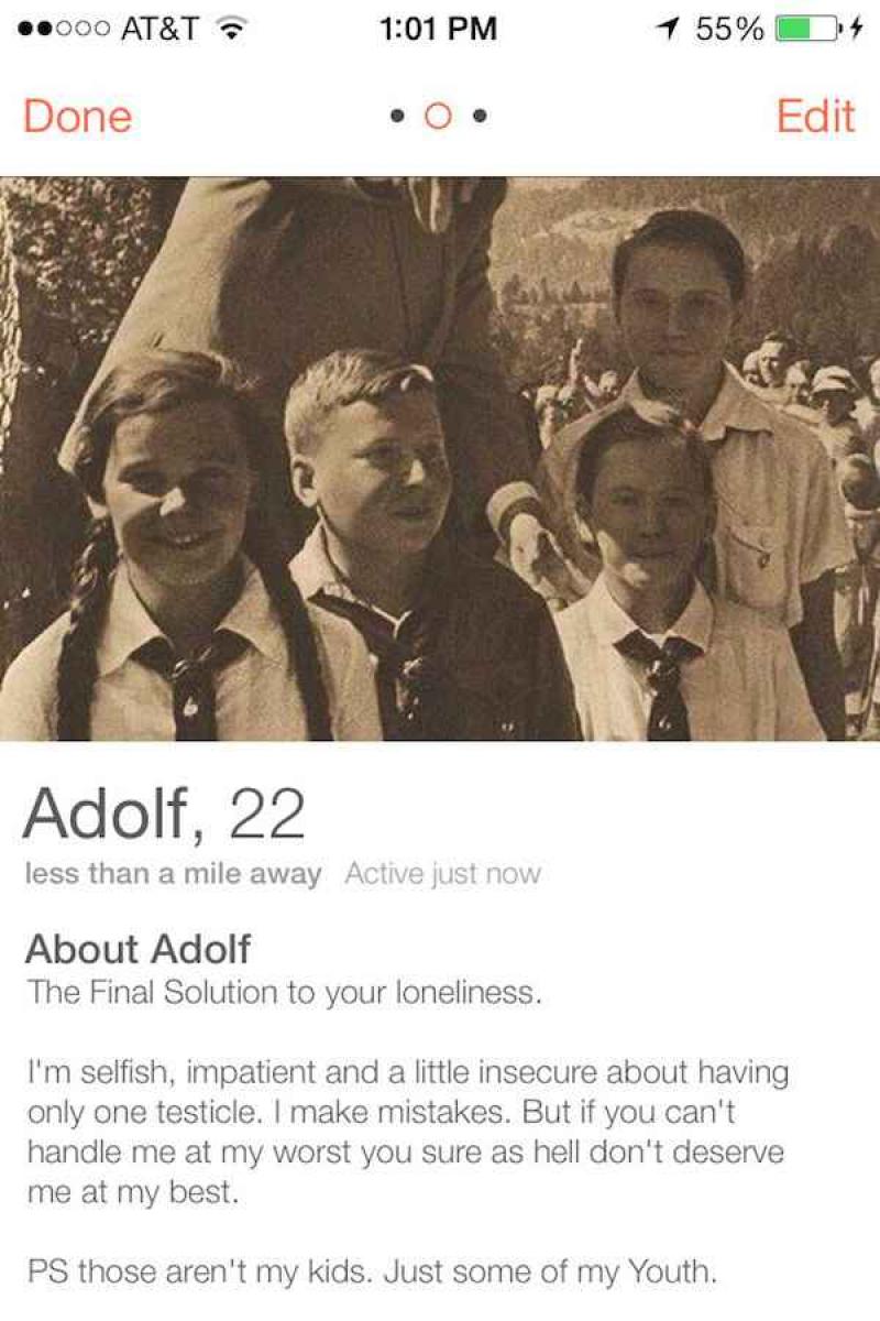 Misschien dacht je dat Adolf Hitler in 1945 stierf, maar dan zit je mis, want hij oogt levend, in ieder geval in geest, op de populaire datingapp Tinder... en hij heeft nog succes ook. De man achter de grap post al een maand op Reddit als Adolf Hitler en maakte zelfs een profiel aan op Tinder.