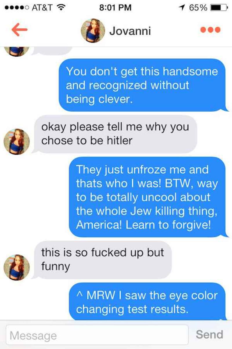 Er is alleen bekend dat de persoon achter de voormalige dictator van nazi-Duitsland een iPhone heeft en dat hij op het AT & T-network zit. Dat iemand zich uitgeeft als één van de meest gehate mensen uit onze geschiedenis is op zich verontrustend, maar wat nog veel verontrustender is, is dat er blijkbaar een heleboel vrouwen zijn die hem wel zien zitten. We zullen hen maar het voordeel van de twijfel geven en denken dat hun nieuwsgierigheid de bovenhand kreeg.