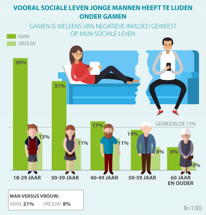 Volgens het onderzoek heeft niet alleen de relatie maar ook het sociale leven van de ondervraagden te lijden onder gamen. Zo zegt 15% dat gamen weleens voorrang krijgt op hun sociaal leven. Hier laten de mannen zich wel vaker beïnvloeden dan de vrouwen: 21% tegenover 8%. Gamen blijkt vooral een dooddoener voor het uitgaansleven van jongeren tot 30 jaar. Maar liefst een derde van hen gamet liever dan met vrienden uit te gaan.
