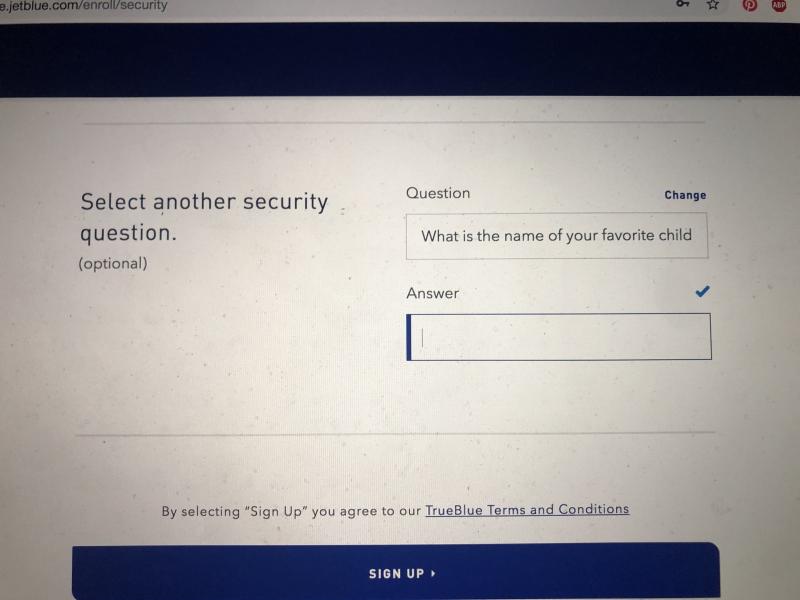 Als je je wachtwoord vergeten bent, kan je dat resetten door een aantal beveiligingsvragen te beantwoorden. Twittergebruiker @_lanaloo startte die procedure onlangs op de website van de Amerikaanse low-fare luchtvaartmaatschappij JetBlue Airways. Tot zijn grote verbazing kreeg hij volgende vraag voorgeschoteld: Wat is de naam van je favoriete kind?. Hij plaatste een screenshot van de vraag op Twitter en kreeg niet lang daarna ook antwoord van JetBlue: Zeg het. Je weet dat je er een hebt, klonk het.
