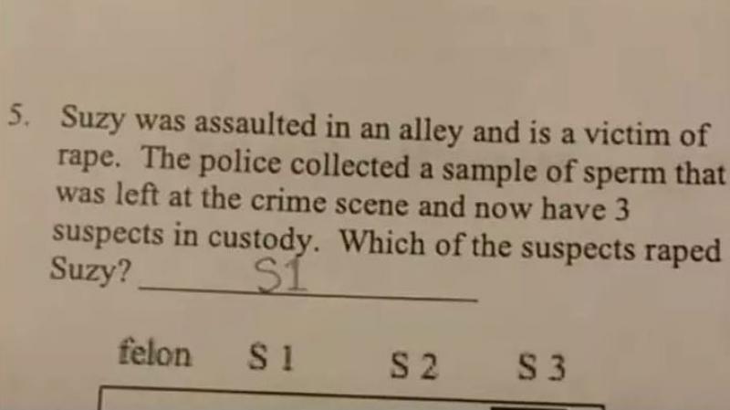 De 14- en 15-jarige leerlingen van de Klein Collins High School in Houston (Texas) keken onlangs raar op toen ze hun huiswerk maakten. Bij een van de vragen moesten ze uitvissen wie de dader was in een verkrachtingszaak. De vraag luidde als volgt: Suzy werd verkracht in een steegje. De politie onderzocht een spermastaal dat ze op de plaats delict hadden aangetroffen en pakte drie verdachten op. Wie van hen verkrachtte Suzy?.