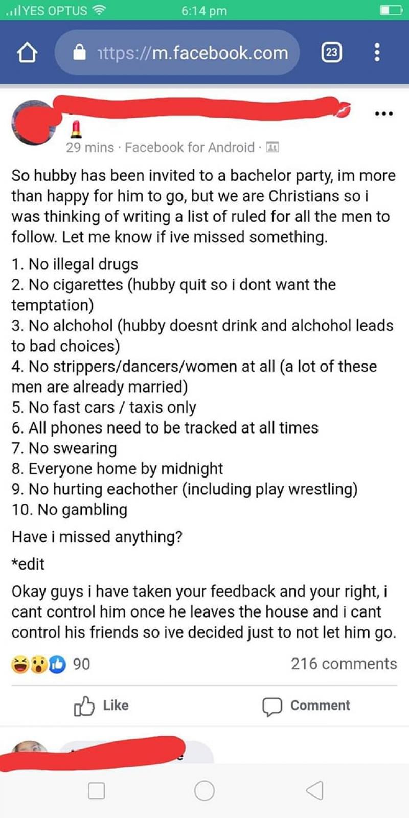 Na de feedback van haar vriendinnen kwam de vrouw tot de conclusie dat ze niet zal kunnen controleren of haar man de regels wel opvolgt. Daarom besliste ze om haar man uiteindelijk niet naar het vrijgezellenfeestje te laten gaan.