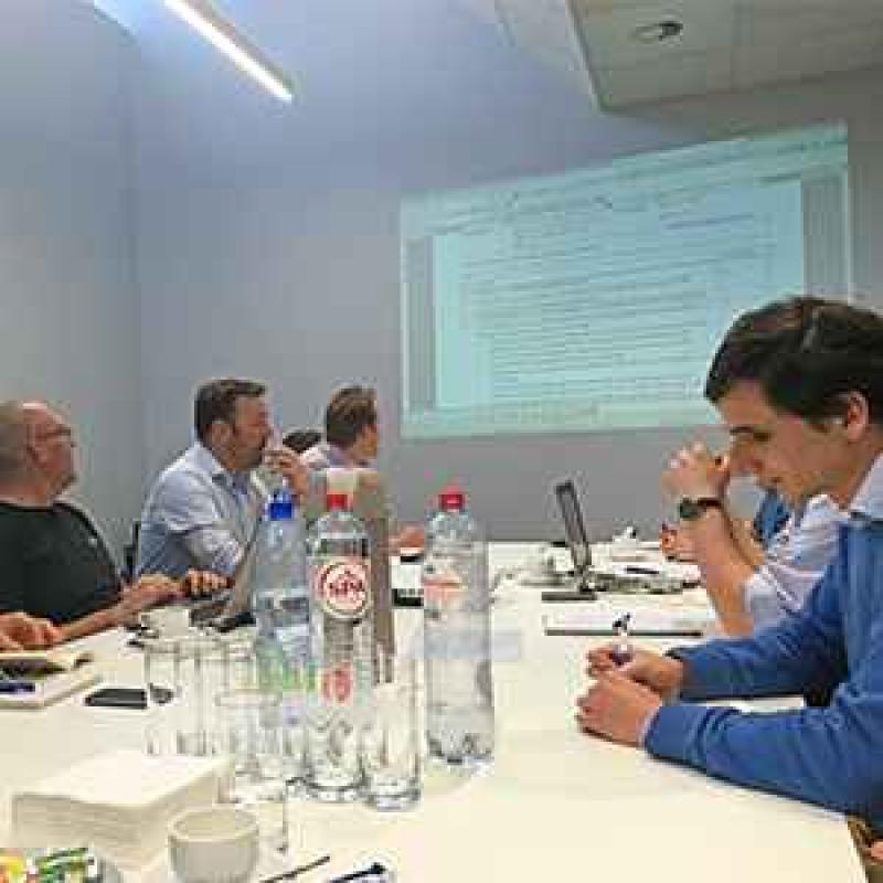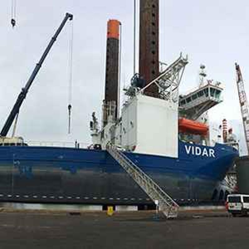 Met een onderaannemer aan boord van de Vidar, het offshore installatieschip dat zal worden ingezet voor het plaatsen van de turbines op het Nobelwindpark, heb ik een progress meeting.