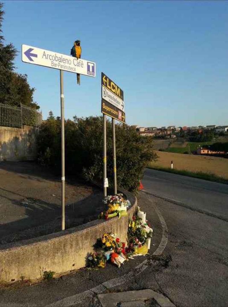 De Italiaanse profrenner Michele Scarponi (37) is vorige week jammerlijk verongelukt. Zijn mascottepapegaai en trainingspartner is gezien op een bord waar bloemen zijn neergelegd voor de overleden coureur.