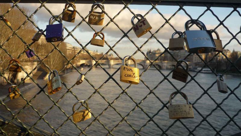 De Pont des Arts in Parijs is een van de meest romantische bruggen. Duizenden koppels uit de hele wereld hebben daar hun hangsloten vastgeklemd aan de leuningen van de brug wat symbool staat voor "liefde die voor altijd wordt opgesloten".