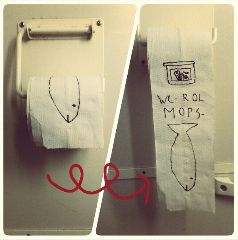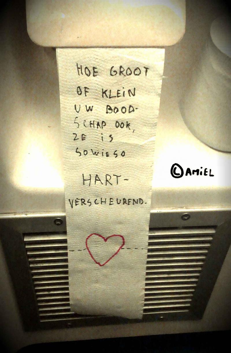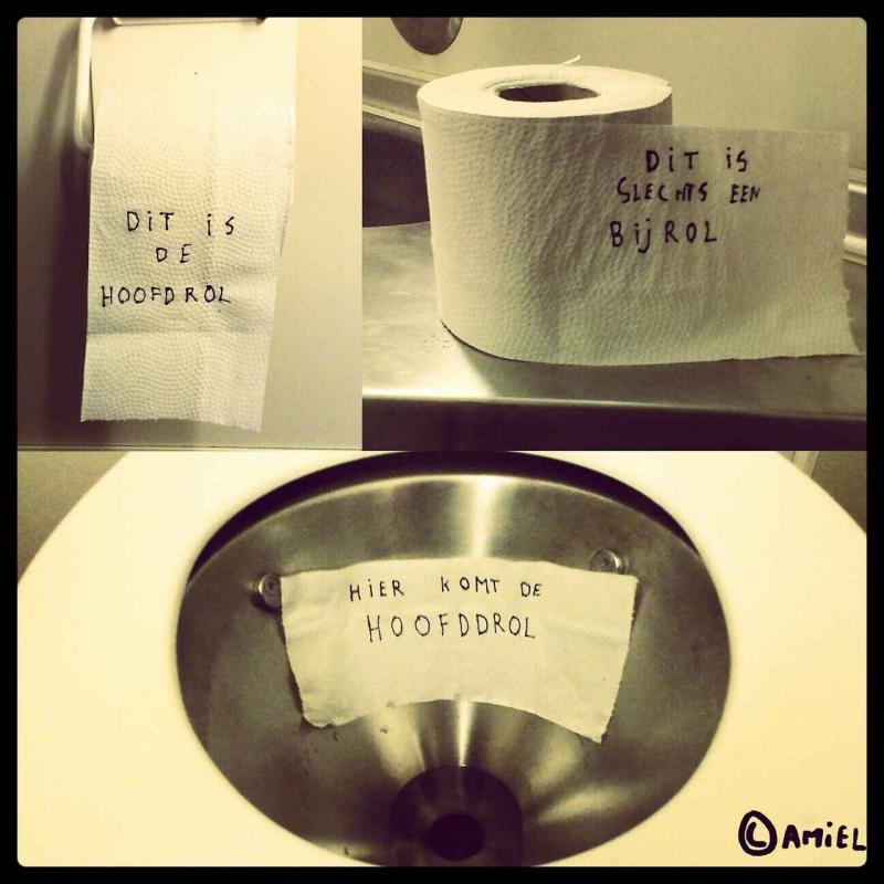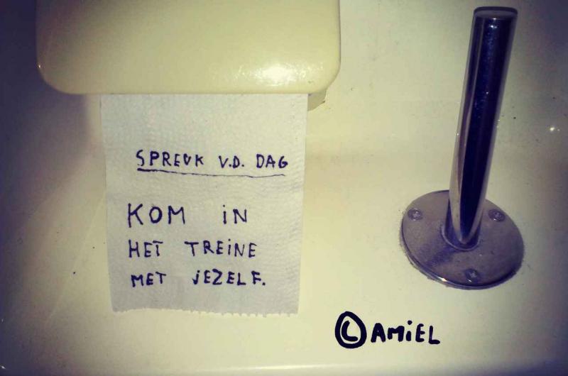 De 21-jarige Kamiel De Bruyne houdt zich tijdens het pendelen het liefst bezig met 'de kunst van het tekenen op toiletpapier'. Wat moet je anders doen tijdens een saaie treinrit? Ondertussen fleurde hij al zoveel toiletten van de NMBS op, dat hij besloot om zijn beste pareltjes te bundelen in een boek. Maar wie o wie voelt zich geroepen om dit uit te geven?