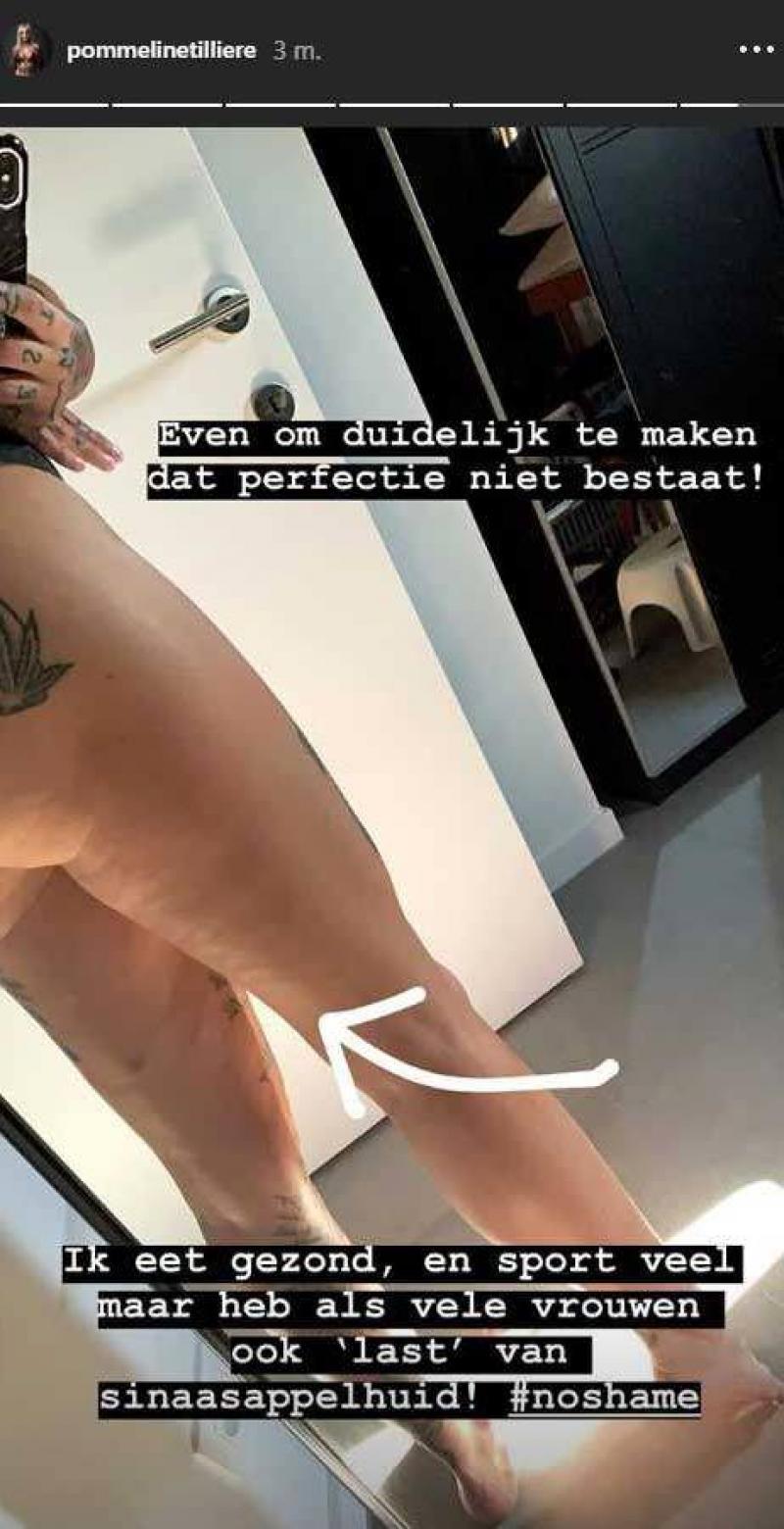 De Oost-Vlaamse blondine beseft dat ze cellulitis heeft, maar schaamt zich daar niet voor. Integendeel, ze maakte er zelfs een foto van om aan te tonen dat perfectie een illusie is. Even om duidelijk te maken dat perfectie niet bestaat! Ik eet gezond en sport veel, maar heb net als vele vrouwen ook last' van sinaasappelhuid. #noshame, schreef ze op Instagram.
