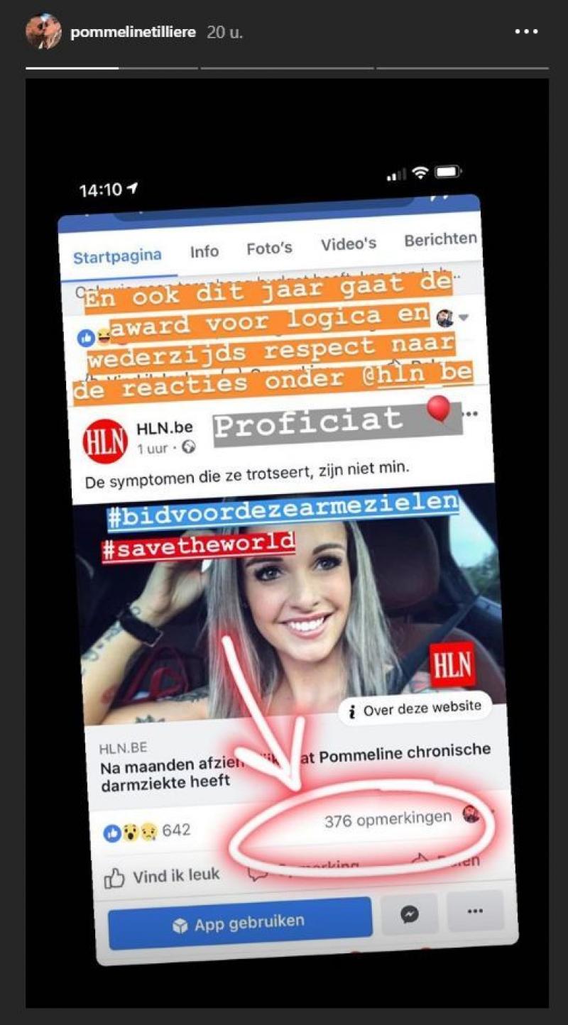Pommeline kwam de negatieve reacties ook onder ogen, en deelde op Instagram haar ongenoegen erover. En ook dit jaar gaat de award voor logica en wederzijds respect naar de reacties onder @hln.be. Proficiat! Bid voor deze arme zielen. #savetheworld, schreef ze.