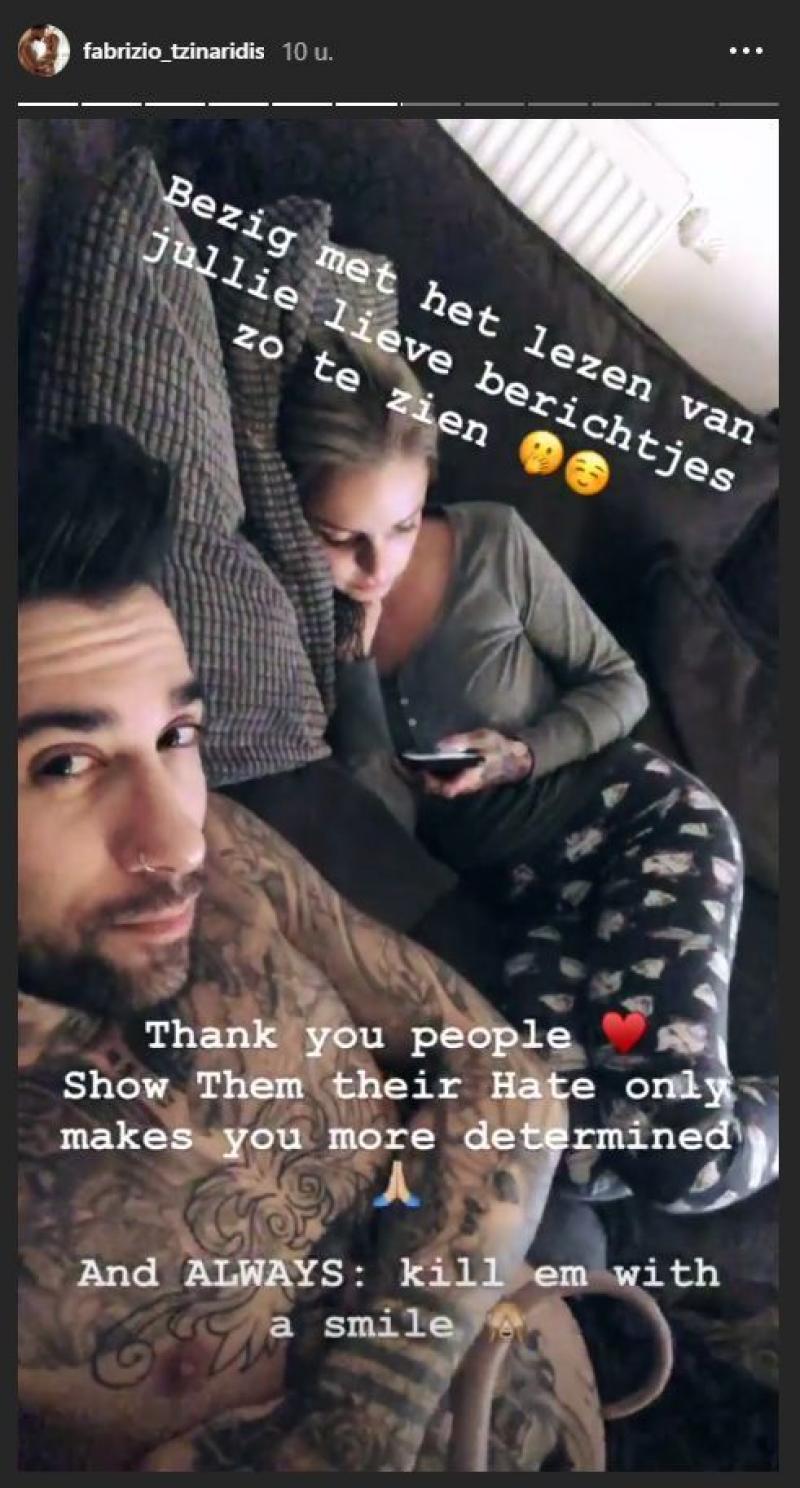 Ook haar verloofde Fabrizio Tzinaridis zag hoe Pommeline geraakt werd door de haatdragende kritiek. Bezig met het lezen van jullie lieve berichtjes, zo te zien. Thank you, people. Show them their hate only makes you more determined. And always: kill em with a smile, klonk het op zijn Instagram.