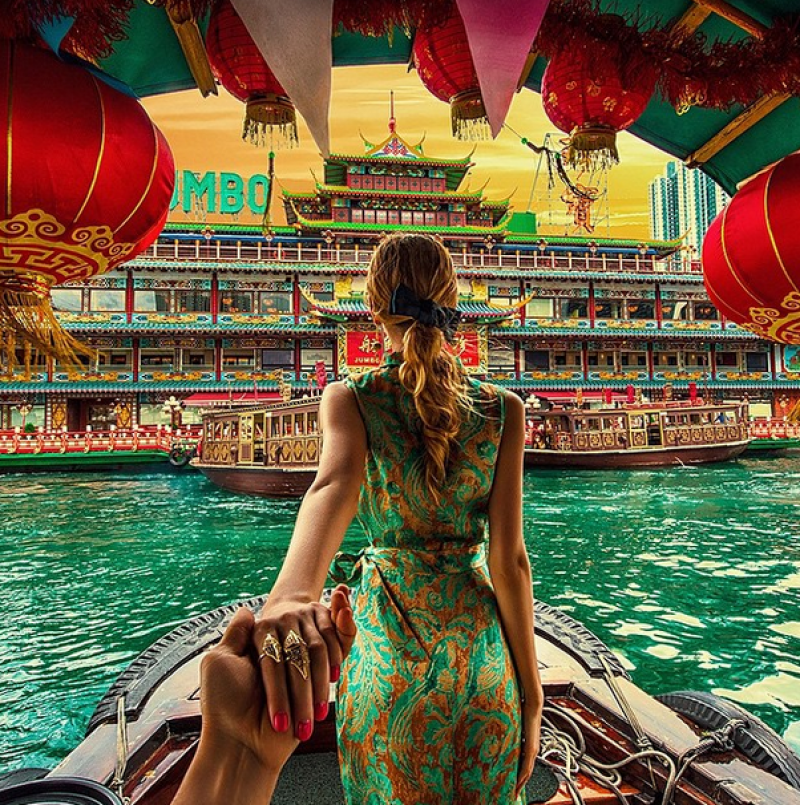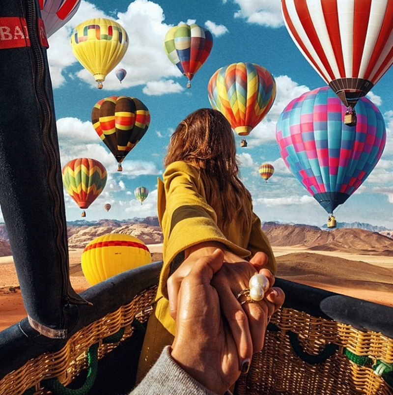 De fotograaf is de Rus Murad Osmann, zijn vriendin Natalia Zakharova.