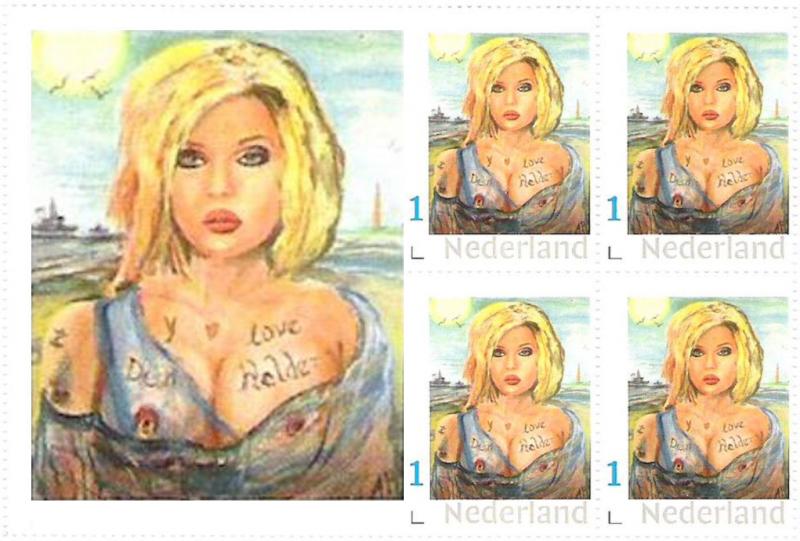 De afbeelding is het werk van schilder Ap Kooister uit Den Helder. Op de postzegel staat een rondborstige, blonde dame met gepiercete borsten met I love Den Helder' erop.