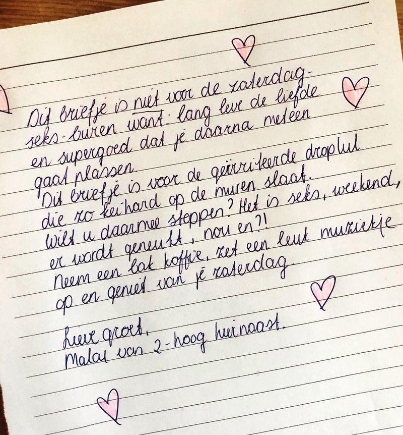 De Radio 1-presentatrice voor BNN VARA besloot om haar ergernis te ventileren in een briefje. Dit briefje is niet voor de zaterdag-seks-buren want: lang leve de liefde en supergoed dat je daarna meteen gaat plassen. Dit briefje is voor de geïrriteerde droplul die zo keihard op de muren slaat. Wilt u daarmee stoppen? Het is seks, weekend, er wordt geneukt, nou en?! Neem een bak koffie, zet een leuk muziekje op en geniet van je zaterdag. Lieve groet. Malou van 2-hoog hiernaast, schreef ze.