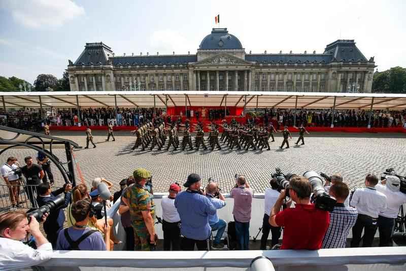 16u.: Het is tijd voor een van de hoogtepunten van elke nationale feestdag: het defilé waarin militairen en politieagenten marcheren. Het thema van dit jaar is Fier om te dienen'. Het wordt ingezet met een luchtdefilé met 35 vliegtuigen en helikopters. Daarna komen detachementen van de Koninklijke Militaire School, detachementen van de Koninklijke School voor Onderofficieren en een detachement van het Europcorps, dat dit jaar zijn 25-jarig bestaan viert. Ook troepen voor buitenlandse operaties (Mali, Centraal-Afrika) stappen mee. Allerhande gemotoriseerde voertuigen sluiten het evenement af.