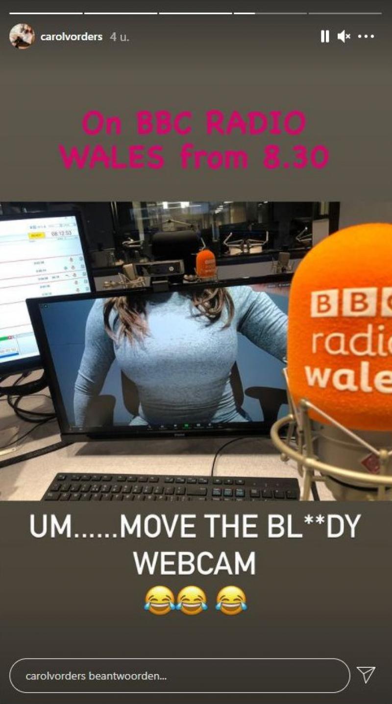 Vorderman presenteerde vanmorgen het radioprogramma Final Score' op BBC Radio Wales. Het programma was ook live te volgen via de webcam, maar dat liep niet meteen van een leien dakje. De camera focuste immers op haar borsten, wat uiteraard niet de bedoeling was. Euh, kan de webcam aangepast worden?, knipoogde ze op Instagram.
