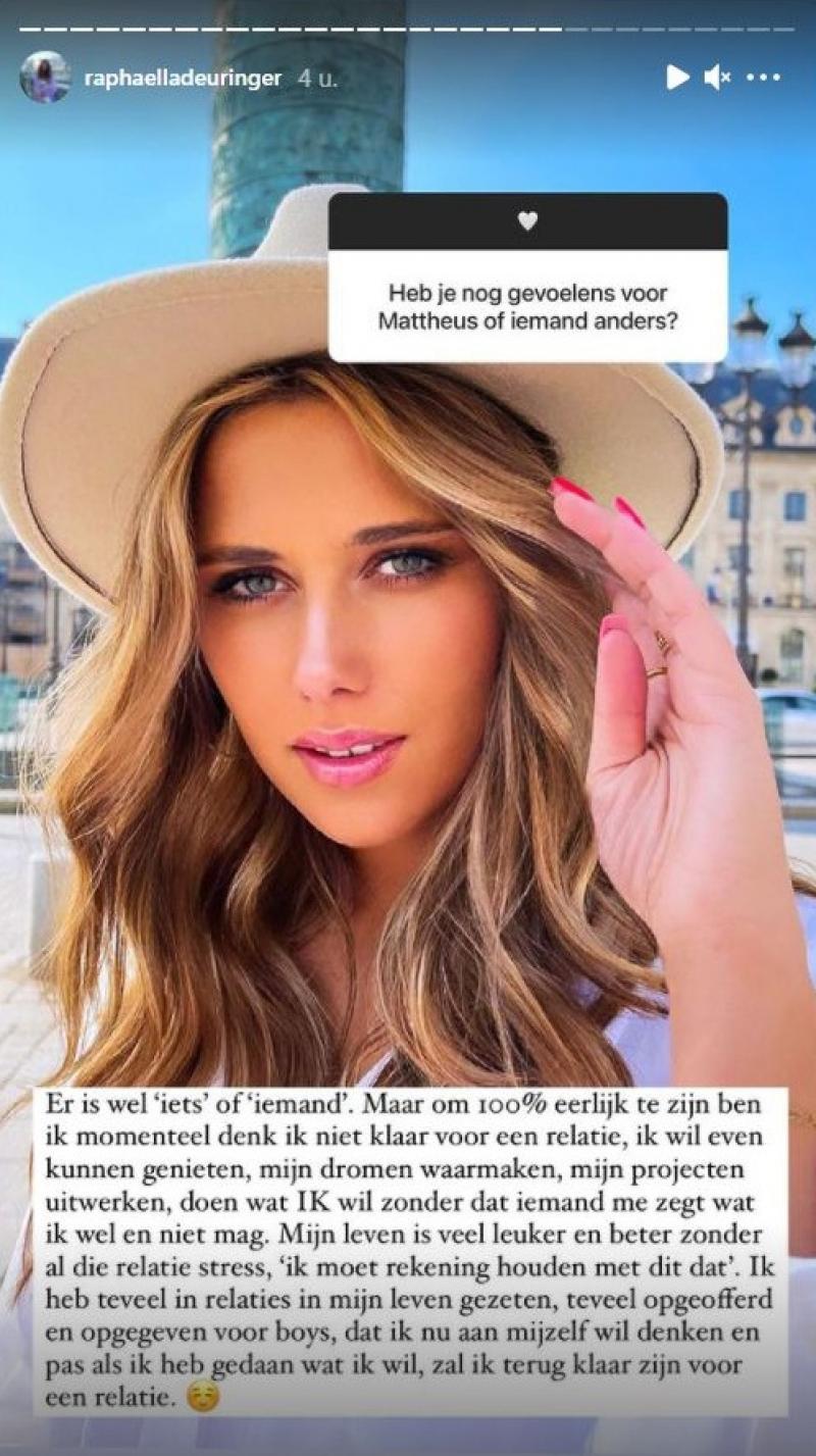 We zijn inmiddels een dik half jaar verder en helemaal vrijgezel lijkt de 22-jarige brunette uit Waterloo niet meer te zijn. Een volger vroeg haar of ze nog gevoelens heeft voor Mattheüs of iemand anders. "Er is wel 'iets' of 'iemand'. Maar om 100% eerlijk te zijn ben ik momenteel niet klaar voor een relatie. Ik wil even kunnen genieten, mijn dromen waarmaken, mijn projecten uitwerken, doen wat IK wil zonder dat iemand me zegt wat ik wel en niet mag. Mijn leven is veel leuker en beter zonder al die relatiestress. Ik heb in mijn leven te veel in relaties gezeten, te veel opgeofferd en opgegeven voor mannen dat ik nu aan mezelf wil denken en pas als ik heb gedaan wat ik wil, zal ik terug klaar zijn voor een relatie", schrijft ze.