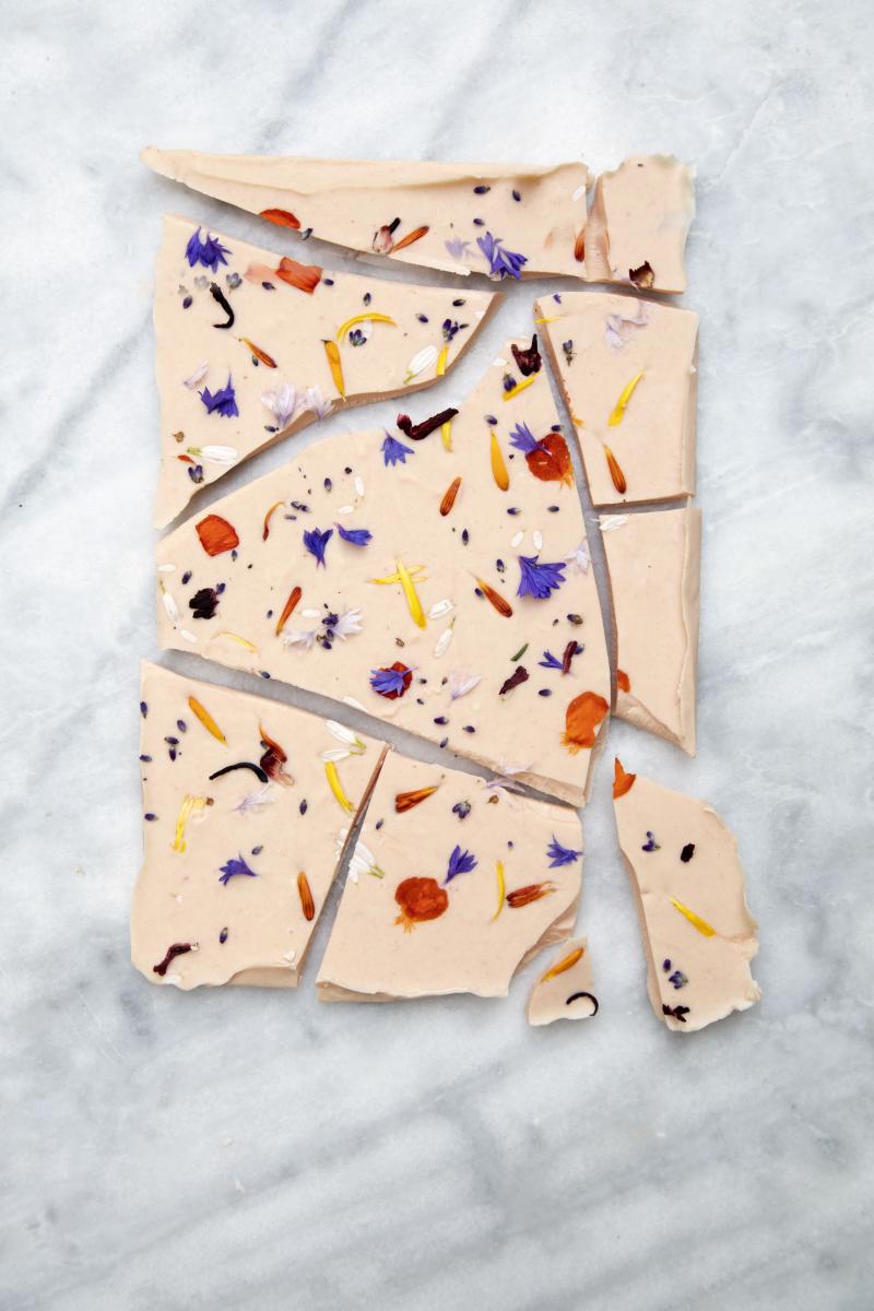 Neem een rechthoekige bakvorm en leg er een vel bakpapier in. Giet de chocolade in de bakvorm, maak het oppervlak glad met een spatel. Laat lichtjes afkoelen en voeg de bloemblaadjes toe als de chocolade nog zacht is.