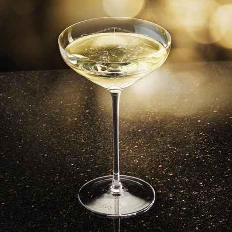 Het glas dat de 34 Kate Moss Coupe werd gedoopt, is voorzien van een slanke stam en een kom gedecoreerd met een geometrisch patroon. De handtekening van Moss staat in de voet van het glas gegraveerd.